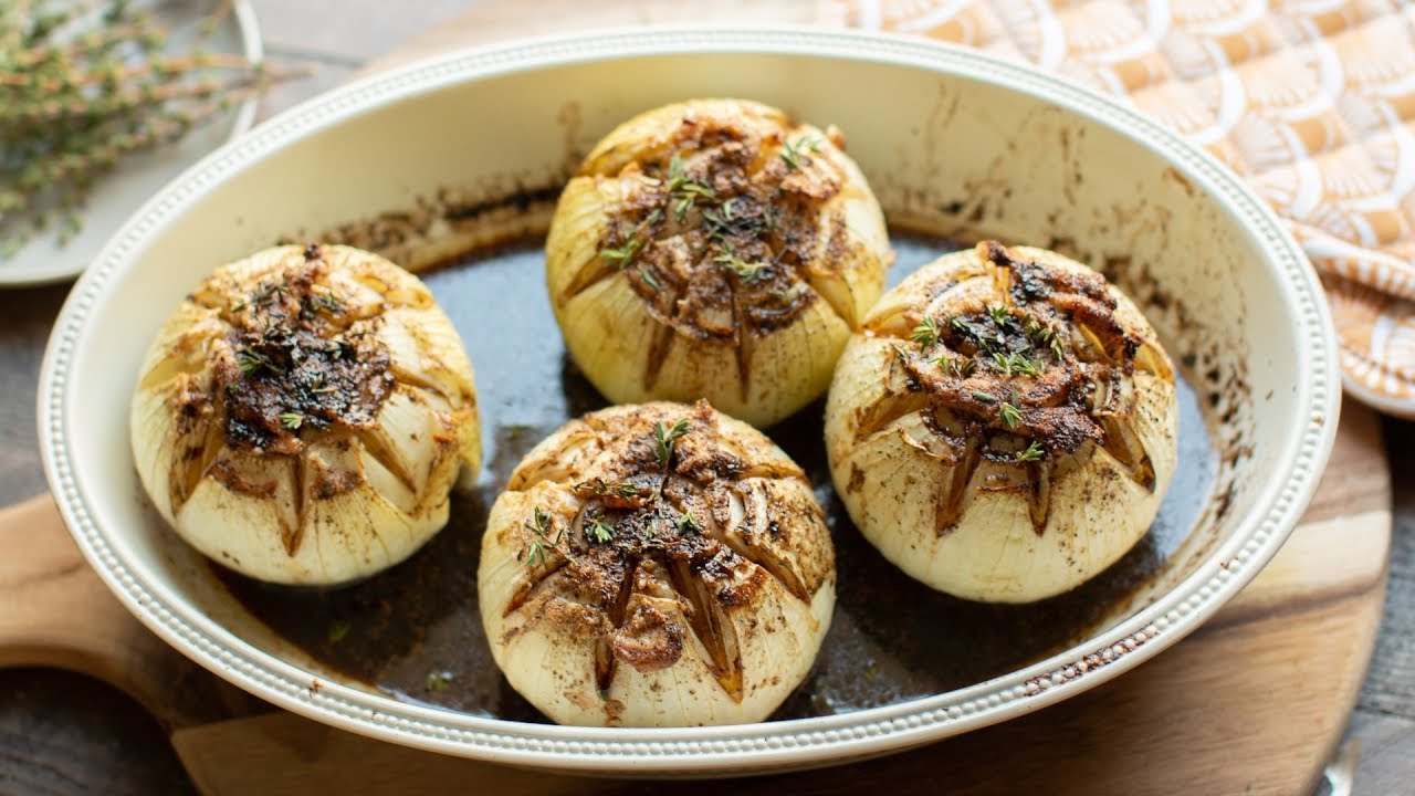 Bake uncovered or loosely covered for 45–60 minutes, depending on size. Halfway through, spoon some of the pan juices over the onions to boost flavor and tenderness.