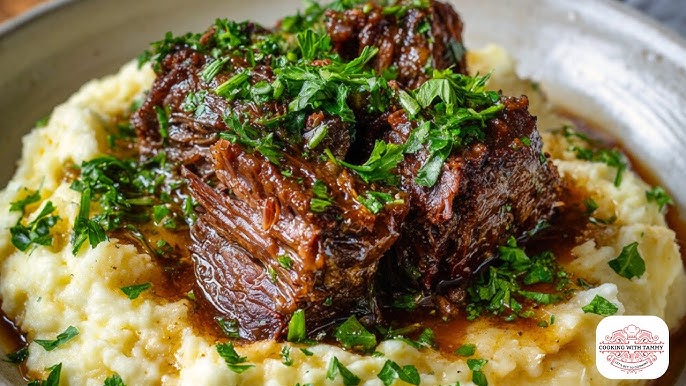 Creamy mashed potatoes complement the rich beef perfectly.