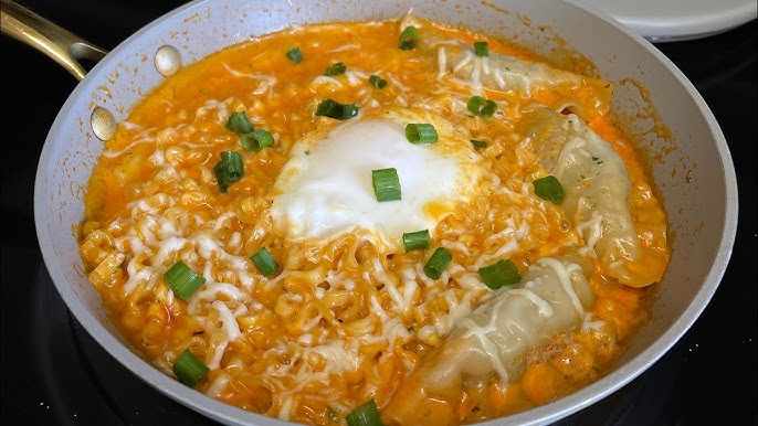 This viral Korean dish takes the heat of Samyang’s famous Hot Chicken Flavor Ramen (aka Buldak) and merges it with the richness of a classic Italian carbonara sauce. The result? A spicy, cheesy, creamy noodle dish that’s both comforting and addictive.