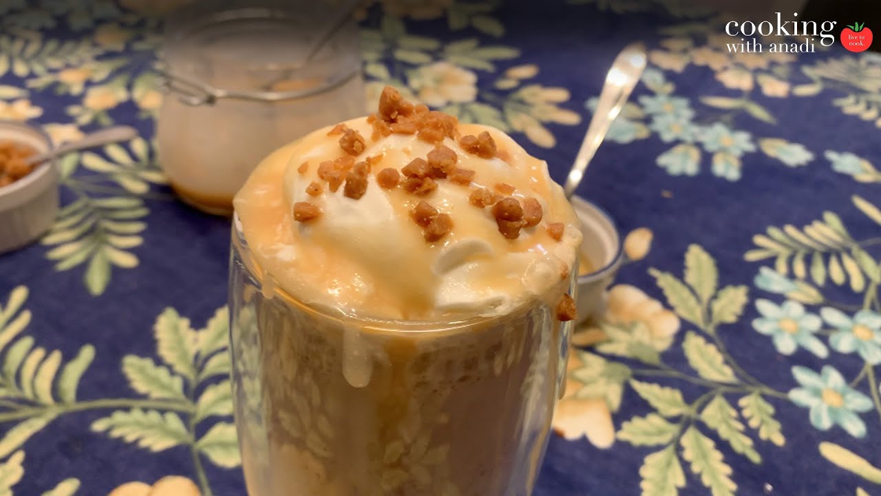 Top generously with whipped cream, more caramel drizzle, and crunchy caramel bits or crushed toffee. Serve immediately with a straw and enjoy that creamy, crunchy, coffeehouse-style treat at home. ☕🍮✨