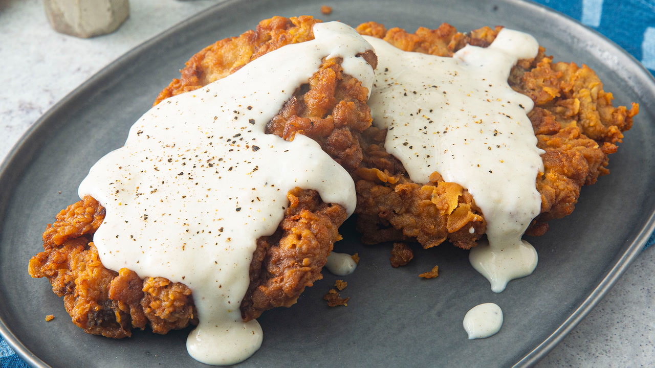 The contrast between the crisp steak and the smooth gravy makes this meal especially satisfying.
