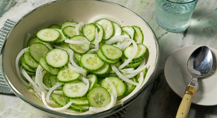 This cucumber dish fits naturally into many meals. We can serve it alongside grilled chicken, fried fish, roasted potatoes, rice dishes, or sandwiches. It also works well next to spicy meals because the cool, acidic profile helps balance richer flavors.