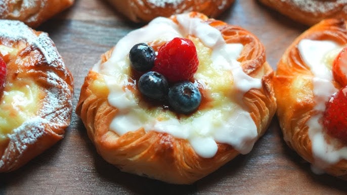 These are the golden, flaky treats you often see at bakeries—shaped into pinwheels, pockets, or spirals and topped with fruit, jam, or cream cheese.
