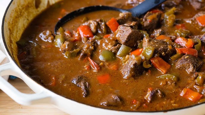 Before cooking, gather and prepare everything. Slice the onions, mince the garlic, chop the peppers and tomatoes, and cut the beef into even cubes. This makes the cooking process smoother and helps everything cook at the right pace.