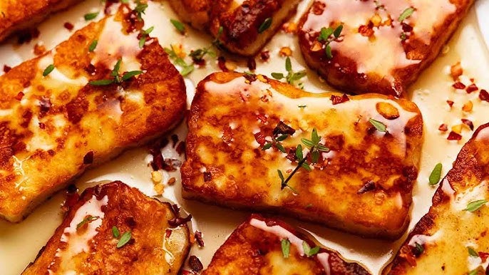- Pan-fry halloumi, then drizzle with honey and sprinkle with chili flakes.