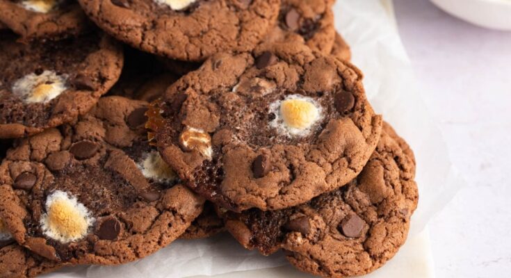 We can gently flatten the tops slightly if we prefer a wider cookie. Pressing a few extra marshmallows and chocolate pieces onto the tops helps the cookies look fuller and more bakery-style after baking.