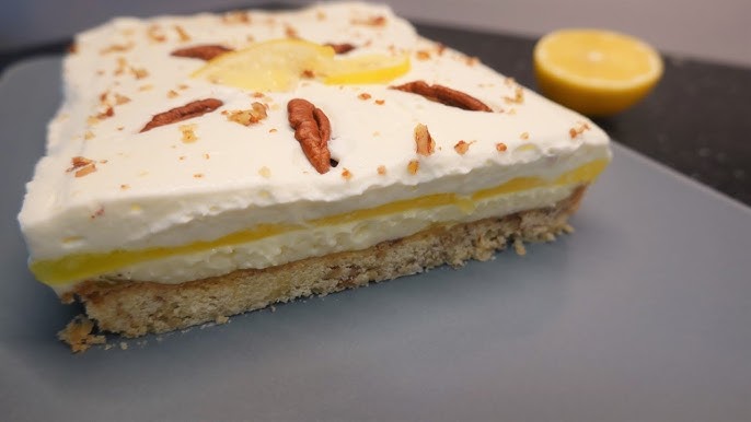 A typical recipe includes flour, butter, and sometimes nuts for the crust, plus cream cheese, powdered sugar, lemon pudding mix, milk, and whipped topping for the layers.