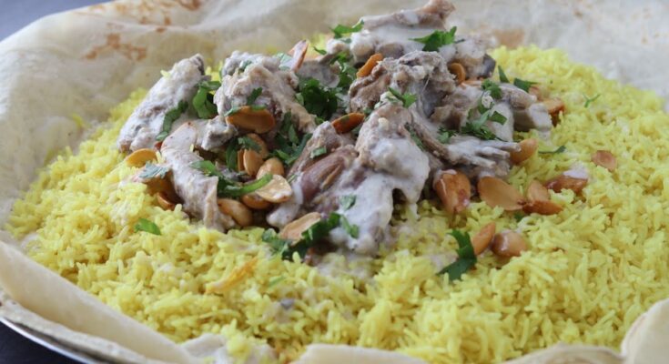 It’s traditionally made with lamb cooked in a fermented dried yogurt sauce called Jameed, served over a bed of rice and thin flatbread, and topped with toasted nuts and herbs. The dish is often eaten communally from a single large platter using the right hand, symbolizing unity and hospitality.