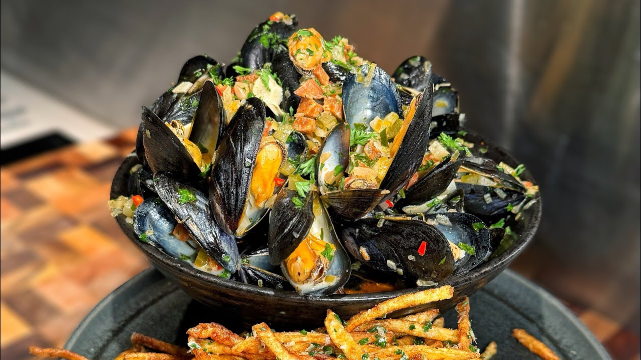 Moules frites is a classic Belgian and French dish made with fresh mussels cooked in a flavorful broth and served with crispy fries. The mussels are often steamed with white wine, garlic, shallots, butter, herbs, and sometimes cream.