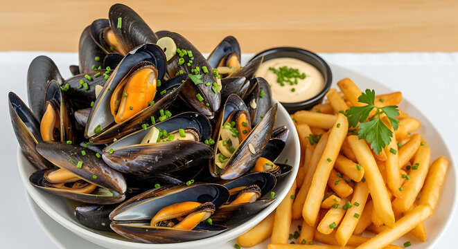 Moules frites is a classic dish made with mussels and fries. The mussels are usually cooked in a flavorful broth, while the fries are served hot and crispy on the side.