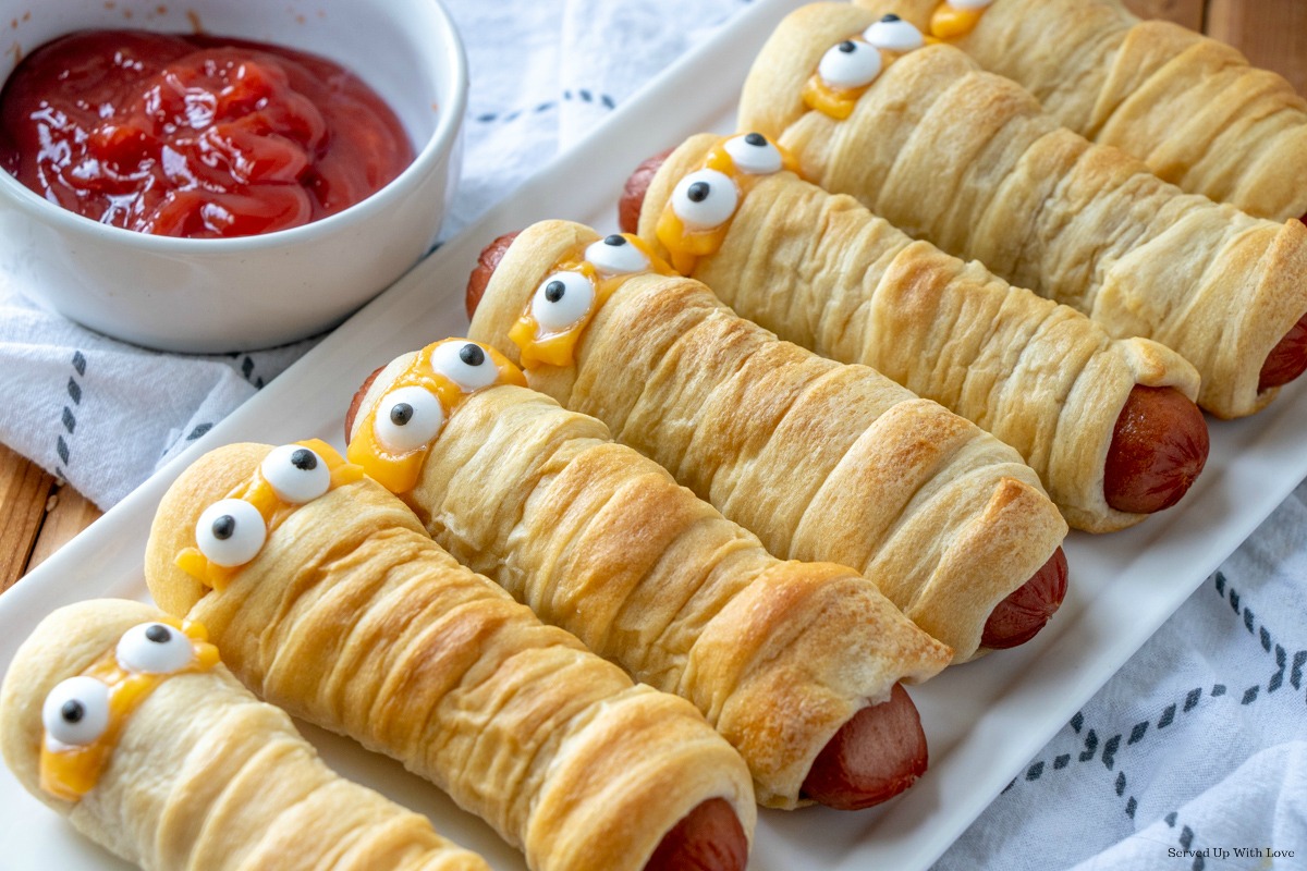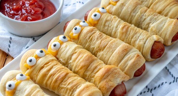 Mummy hot dogs are a fun snack made by wrapping hot dogs in strips of dough to look like mummies, then baking until golden.