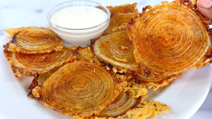 Serve the onion chips immediately after cooking for the best crunch. Arrange them on a plate, sprinkle with a little extra seasoning, and pair them with a creamy dip or spicy sauce. The result is a crisp, golden, flavorful snack that works for casual meals, family gatherings, game nights, and party platters.