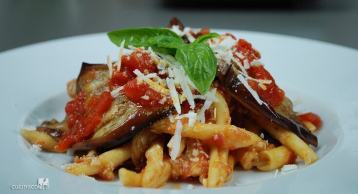 The most common choices are rigatoni, penne, spaghetti, or maccheroni. Short pasta shapes are especially popular because they hold the tomato sauce and pieces of eggplant well.