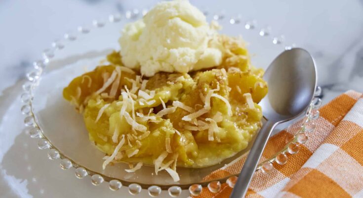 Peach dump cake is best served warm. We can scoop it into bowls and serve it with vanilla ice cream, whipped cream, or a drizzle of caramel sauce. The contrast between the warm peaches and cold ice cream makes this dessert especially delicious.