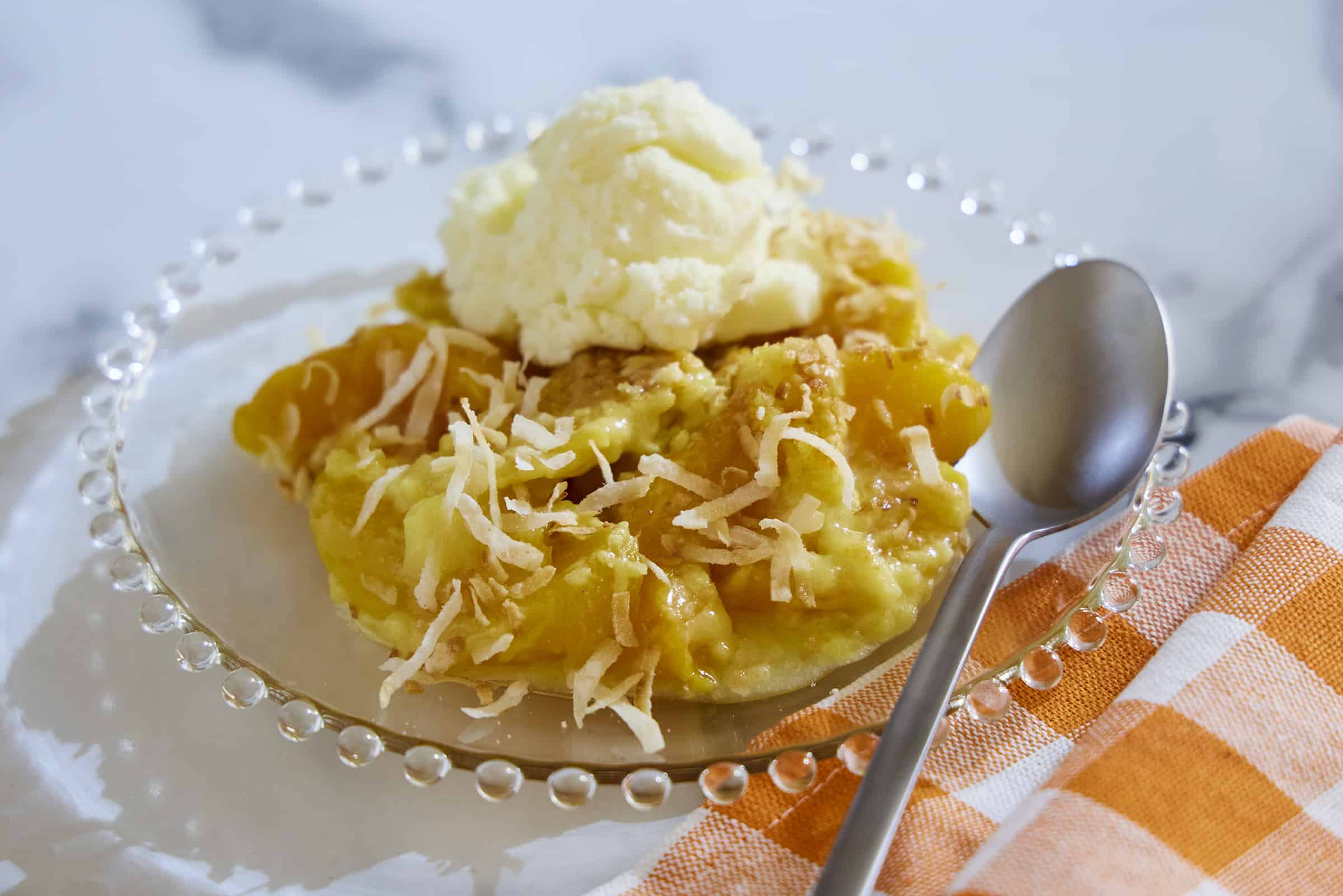 Cut cream cheese into small cubes and scatter them over the peaches before adding the cake mix. This creates creamy pockets throughout the dessert and gives it a cheesecake-like richness.