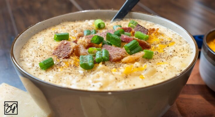 Add chopped bacon, shredded cheddar, green onions, and sour cream. It’s like eating a loaded baked potato with a spoon.