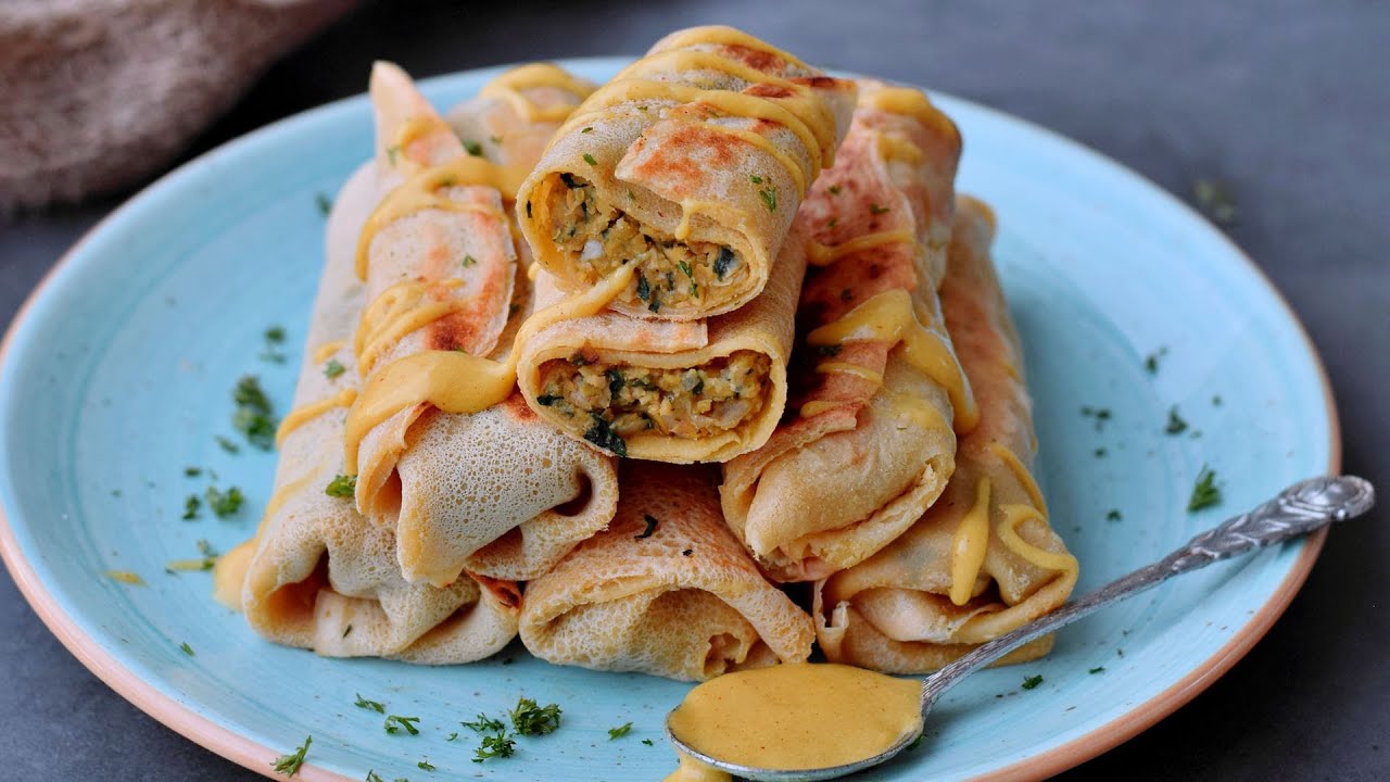 - Spread a layer of hummus on the crepe, add the veggies, and roll it up.