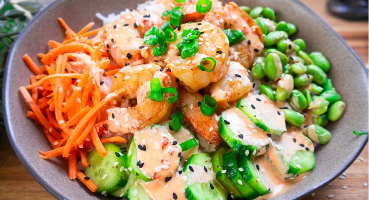 For an Asian twist, swap regular rice for jasmine rice or sticky rice. Marinate the shrimp in soy sauce, ginger, garlic, and sesame oil, then top the bowl with edamame, shredded carrots, cucumbers, and pickled ginger. A drizzle of teriyaki glaze or spicy sriracha mayo completes the dish. Don’t forget a sprinkle of sesame seeds for that authentic touch.
