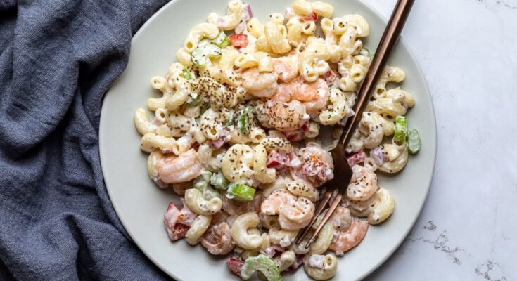 Shrimp pasta salad is best served chilled, but not ice cold. Let it sit out for 10–15 minutes before serving to bring the flavors forward.
