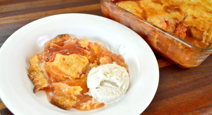 Once it’s cooled slightly, grab a spoon and dig into the warm, buttery layers of cobbler and juicy peaches. Every bite is like a little piece of peachy heaven.