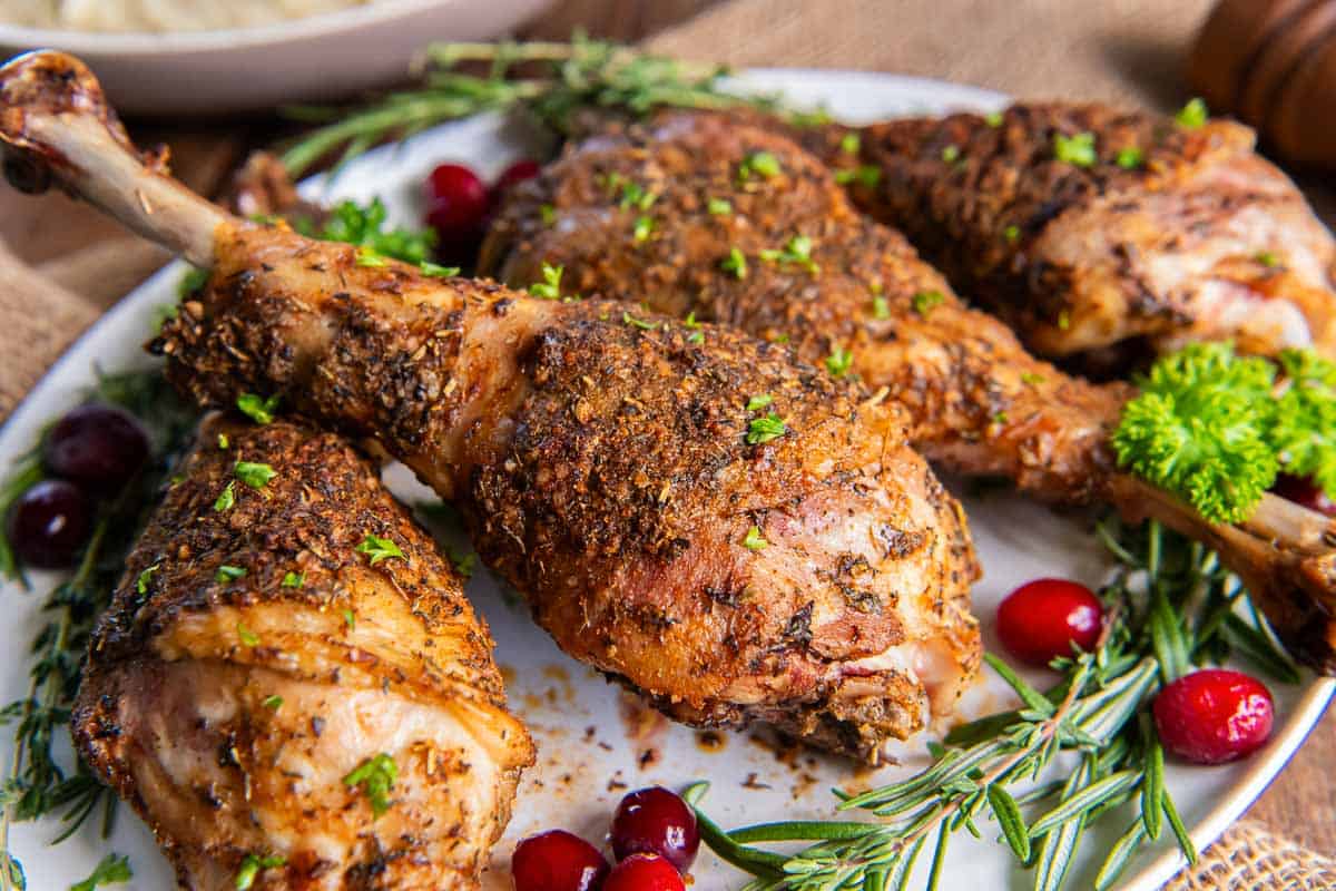 Marinate the turkey in soy sauce, ginger, garlic, and a touch of honey. Roast or grill until caramelized, then garnish with sesame seeds and chopped green onions. These drumsticks go perfectly with steamed rice and stir-fried veggies.