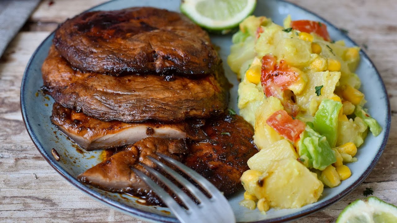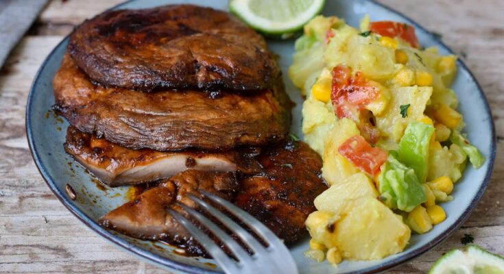Vegan mushroom steak is a plant-based dish made by cooking large mushrooms, usually portobello, until tender and flavorful. It is often served as a meat-free main course.