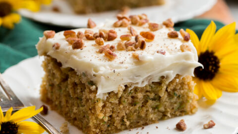 In the freezer: Want to make it ahead or save leftovers? Zucchini cake freezes like a dream. Wrap slices (or the whole unfrosted cake) tightly in plastic wrap, then aluminum foil, and place in a freezer-safe bag or container. It can stay good for up to 3 months. When you’re ready to enjoy, thaw it in the fridge overnight and bring it to room temperature before serving.